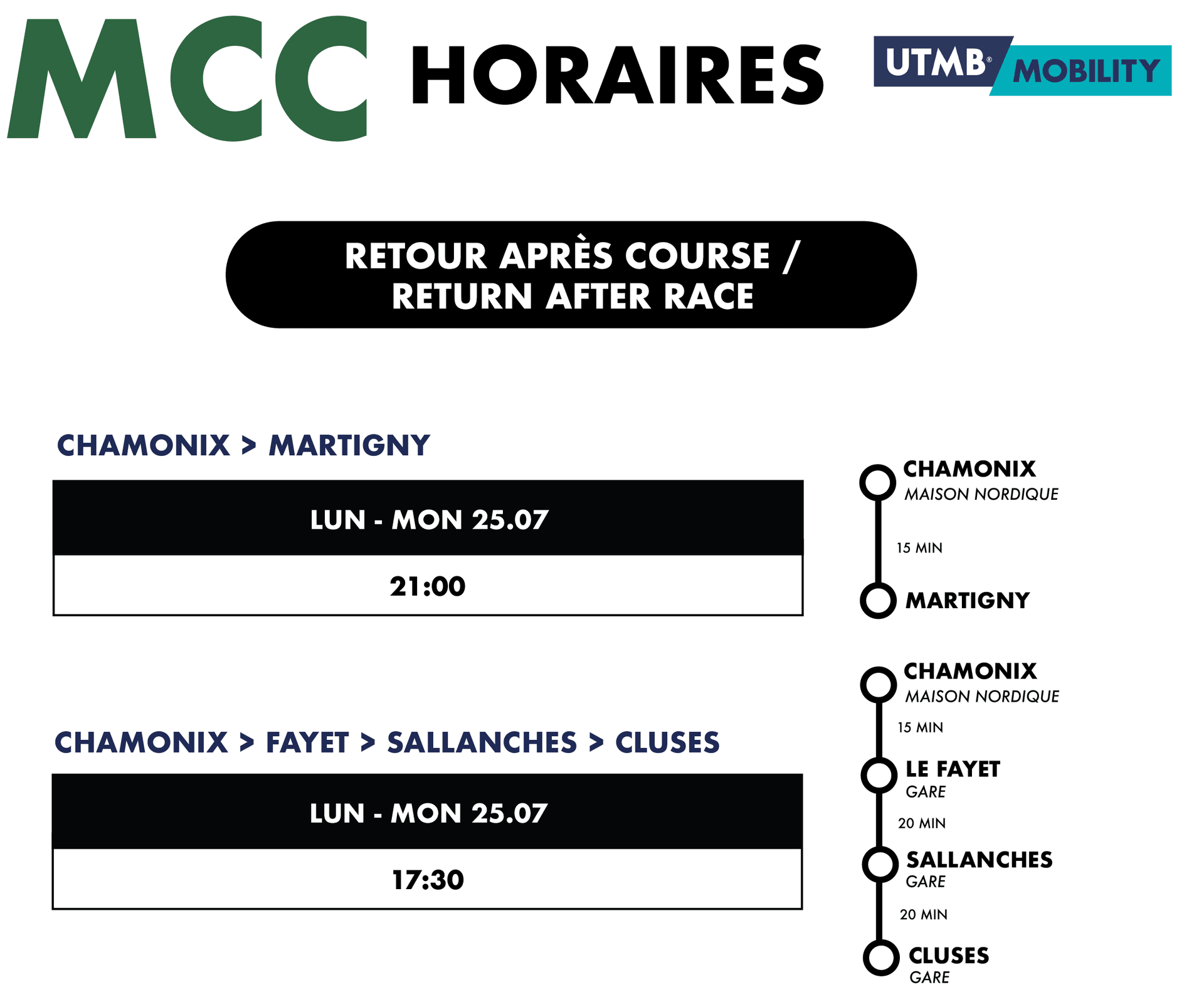 As a reminder, the access to the departure for MCC runners must be done by using the UTMB Mobility service. For Swiss residents, a proof of residence must be transmitted to the organisation. Without one of these condition, your race time will be subject t
