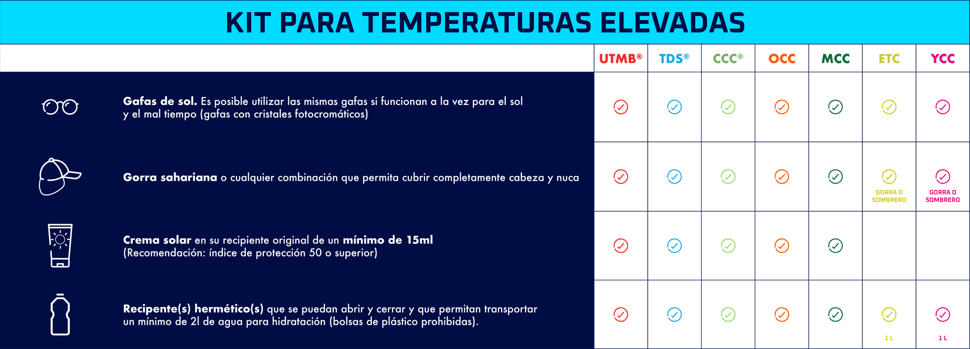 Los kits "canícula" y "tiempo adverso" forman parte integral del material obligatorio. En función de las condiciones meteorológicas, el organizador puede activar un kit y avisar a los participantes antes de la apertura de la entrega de dorsales de cada carrera.