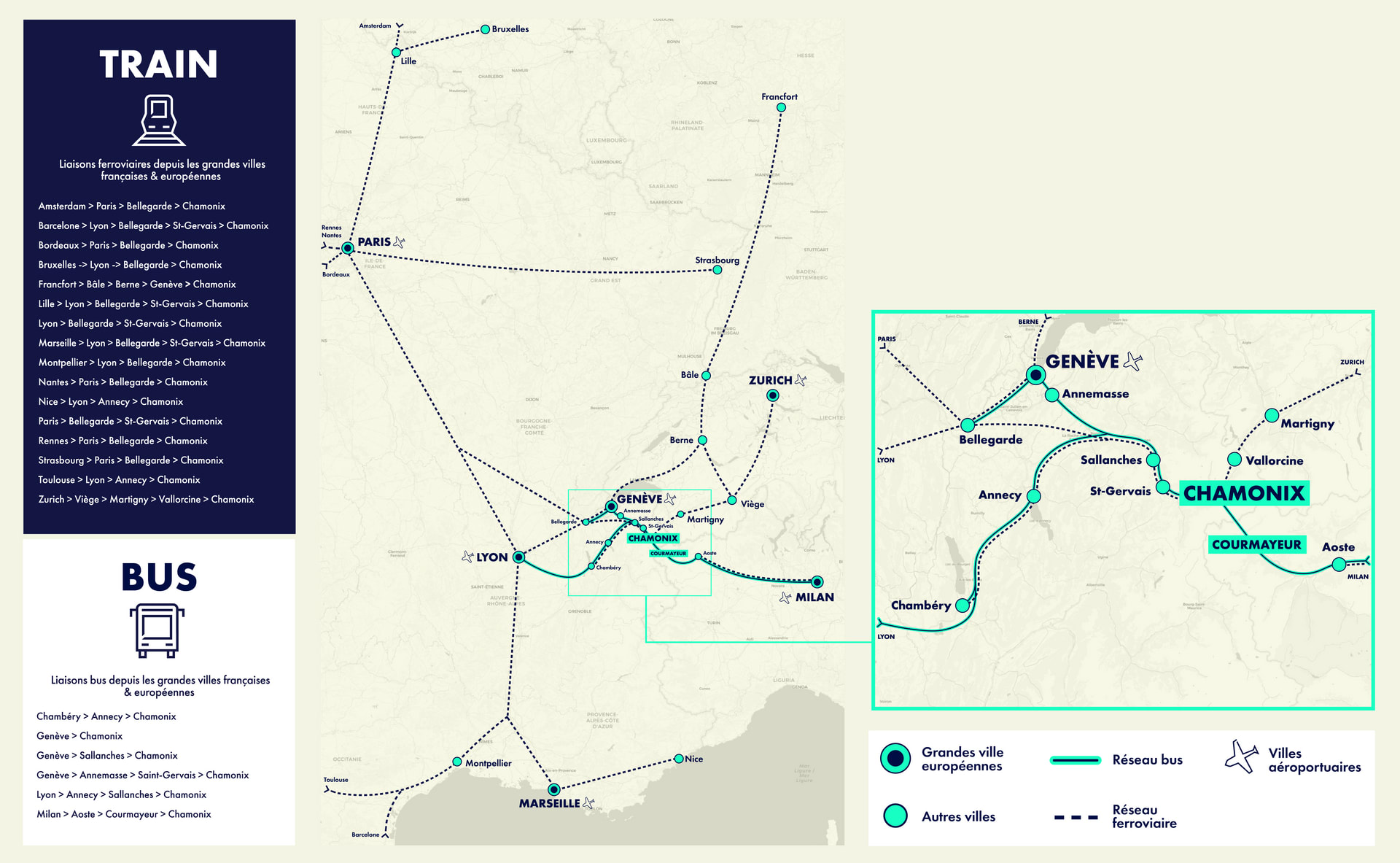 - Paris (CDG/ORY) – TGV direct vers Annecy ou Bellegarde, suivi d'un train ou d'un bus jusqu'à Chamonix.